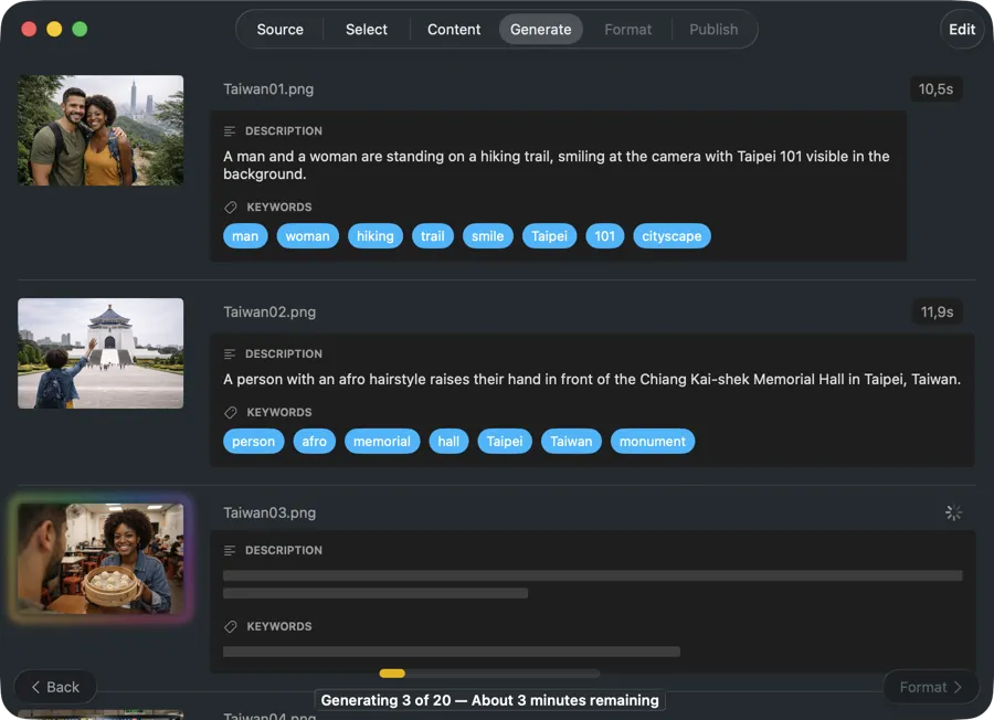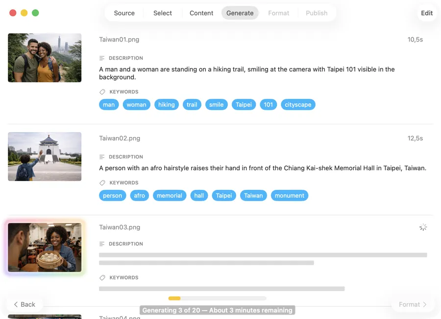 Drop a folder of exports — JPEG, PNG, RAW, or other common formats — or select images from Photos. VisionTagger generates metadata for every image in one run, so you don’t have to open and tag files one by one.